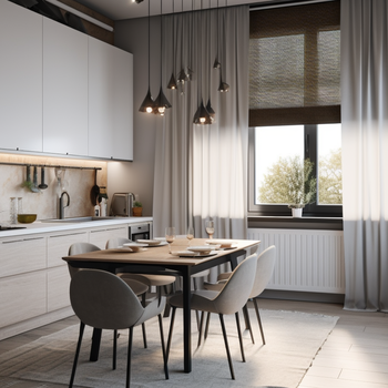 Кухня — это особое пространство, где каждое утро начинается с чашечки кофе и собирается вся семья за обеденным столом. Здесь особенно важно создать уютную, лёгкую атмосферу. Правильно подобранные шторы помогут сделать помещение светлее и визуально просторнее. Мы предлагаем практичные и красивые решения из тканей, которые не боятся кухонных запахов и легко сохраняют свежесть.